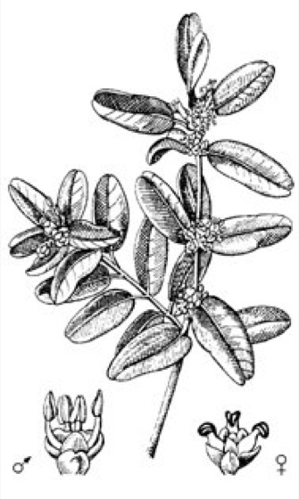 Buchsbaumgewächse, Buchsgewächse, Buxaceae, Familie der Spindelbaumartigen (Celastrales; nach der neueren Systematik der monotypischen Ordnung Buchsbaumartige [Buxales]) mit 6 Gattungen und ca. 100 Arten; ausdauernde, immergrüne Sträucher, Stauden oder selten Bäume, Verbreitungsgebiet weltweit in den gemäßigten bis tropischen Zonen. Blätter ledrig, ganzrandig, gegen-, selten schraubenständig; keine Nebenblätter; dikline Blüten, radiär, entweder einzeln oder häufiger in Blütenständen angeordnet. Bei den staminaten Blüten ist oft ein rudimentärer Fruchtknoten erhalten, karpellate Blüten besitzen einen oberständigen, dreifachen Fruchtknoten; 3 freie Griffel, die auf der Frucht Hörner bilden. Die Frucht ist eine fachspaltig aufspringende Kapsel oder eine Steinfrucht. In seinem Verbreitungsschwerpunkt, dem südeuropäisch-westasiatischen Raum, kann der Immergrüne Buchsbaum (Buxus sempervirens; ä vgl. Abb. und Mediterranregion II) bis 20 m hoch werden. Er ist auch im süddeutschen Raum ursprünglich und kommt an südexponierten Hängen z. B. mit der Flaum-Eiche vor. Nutzung als Gartenpflanze, deren viele Züchtungen in Blattfarben und -formen variieren; wenig ruß- und rauchempfindlich. Da der Immergrüne Buchsbaum Beschneiden gut verträgt, wird er häufig angepflanzt, z. B. als Hecke und Abgrenzung, aber auch einzeln zu geometrischen Figuren geformt. Sein blaßgelbes, hartes Holz mit sehr feinen schmalen Jahresringen ist für Schnitz- und Drechselarbeiten und zur Herstellung von Blasinstrumenten geschätzt, z. B. für Klarinetten und Flöten; früher zum Gravieren verwendet. Weitere Gartenpflanzen sind: Pachysandra procumbens, aus dem südöstlichen Nordamerika stammend; wintergrüner Bodendecker; Pachysandra terminalis, in Japan beheimatet, ein bis 20 cm hoher Zwergstrauch, der am Ende von kahlen Trieben 5–10 cm lange, dunkelgrüne Blätter ausbildet. Simmondsia (Jojoba) ist eine monotypische Gattung, deren einzige Art Simmondsia chinensis (Synonym Simmondsia californica, Jojoba-Strauch, Mittelamerika) extrem unempfindlich gegen Trockenheit ist (Minimum ca. 100 mm Jahresniederschlag). Der Jojoba-Strauch kann als Nutzpflanze auch auf für die Nahrungsmittelproduktion ungeeigneten Standorten angebaut werden (Optimum bei 380–500 mm Jahresniederschlag). Das in seinen Samen enthaltene Jojoba-Öl (eigentlich ein flüssiges Wachs) wird in der kosmetischen Industrie anstelle von Wal-Tran verwendet. Schatthölzer.