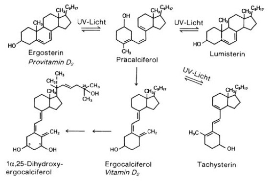 Calciferol s [von *calci –, latein. ferre = tragen], Vitamin D, antirachitisches Vitamin, eine Gruppe fettlöslicher Vitamine, die sich von den Steroiden 7-Dehydrocholesterin (Vorläufer von Cholecalciferol = Vitamin D3) bzw. Ergosterin (Vorläufer von Ergocalciferol = Vitamin D2) durch Spaltung des B-Rings ableiten ( vgl. Abb. ). Diese Spaltung erfolgt durch das auch in der Sonnenstrahlung enthaltene UV-Licht (Ultraviolett) und führt zunächst zu Präcalciferol, aus dem sich durch Umlagerung Calciferol bildet. 7-Dehydrocholesterin und Ergosterin wirken daher als Provitamin D3 bzw. D2. Durch Hydroxylierungen bildet sich aus Cholecalciferol in Leber und Niere die aktive Form, 1α,25-Dihydroxycholecalciferol (Calcitriol), das die Bildung des Calciumbindenden Proteins (Calcium) in den Zellen des oberen Dünndarms induziert. – Calciferole regulieren die Resorption von Calciumionen und Phosphationen aus dem Darm, aus Knochen und den Nierentubuli und damit die Konzentration dieser Ionen im Blut. In dieser Funktion sind Calciferole außerdem wichtig für die Knochenbildung (Knochen). Mangel an Calciferol führt zu Entkalkung des Knochengewebes und damit zu Rachitis (Demineralisation). Daneben wirken Calciferole auf die Differenzierung von Monocyten und die Sekretion von Thyreotropin. Ähnlich wie Steroidhormone vermögen sie über die Bindung an lösliche Rezeptoren im Cytoplasma in den Zellkern zu gelangen und dort die Transkription bestimmter Gene zu kontrollieren. – Cholecalciferol (Vitamin D3) kommt vorwiegend in tierischen Organismen vor, es ist reichlich vorhanden in Fischleberölen (Heilbutt- und Dorschlebertran), ferner in Eigelb, Butter, Milch und in geringen Mengen in Pilzen ( vgl. Tab. ). Ergocalciferol (Vitamin D2) ist in der Natur selten, es kommt neben Cholecalciferol in Fischleberöl vor. Provitamin D2 ist besonders häufig in pflanzlichen Organismen, Provitamin D3 kommt in pflanzlichen und tierischen Fetten vor. – Die für den Menschen erforderliche Tagesdosis an Calciferol ist 10 mg. Neben Calciferolmangel führen auch zu große Mengen zu schweren Erkrankungen (Calcinose) mit Knochenentkalkung, Ansteigen des Blut-Calciumspiegels und Ablagerung von Calciumsalzen in den Wänden von Blutgefäßen und der Niere. Depigmentation, Lumisterin, Windaus (A.O.R.).