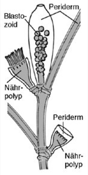 Laomedea, Ausschnitt aus einem Polypenstock mit zwei Nährpolypen und einem Blastozoid, an dem Medusen knospen.