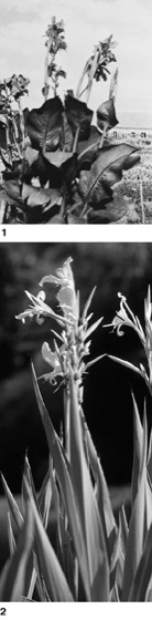 Cannaceae [von griech. kanna = Rohr, Schilf], Blumenrohrgewächse, Familie der Blumenrohrartigen. Die einzige Gattung Canna (Blumenrohr) ist mit über 30 Arten in Mittelamerika heimisch. Die großen, auffälligen Blüten zeichnen sich durch völlige Asymmetrie aus: sie bestehen aus jeweils 3 unscheinbaren Kelch- und Kronblättern, einem unterständigen, aus 3 Karpellen verwachsenen Fruchtknoten und 4–6 rot oder gelb gefärbten, verbreiterten, kronblattartigen Staubblättern, von denen nur eines einen (halben) Staubbeutel trägt. Die Kronblätter sind mit den umgewandelten Staubblättern zu einer gedrehten Röhre verwachsen. Bekannteste Art ist die im nördlichen Südamerika heimische Canna indica (syn. Canna edulis; vgl. Abb. ), eine 2–3 m hohe Rhizomstaude mit großen dunkelgrünen, purpurn getönten Blättern, gelben bis dunkelroten Blüten mit sehr schmalen "Blütenblättern" in endständigen, traubigen Infloreszenzen und schwarzen Samen in fleischigen, stachligen Kapseln. Nach ihr wurden die heute in großer Vielfalt gezüchteten Gartensorten benannt, bei denen es sich durchweg um Hybriden handelt. Canna-indica-Hybriden (Canna × generalis) gibt es mit großen cremefarbigen, gelben, orangen, roten oder rosafarbenen, auch unterschiedlich gemusterten Blüten sowie verschiedenfarbigen Blättern. Einige Stämme von Canna indica werden wegen ihrer stärkereichen Rhizome als Nahrungspflanzen angebaut; aus ihnen gewinnt man das Arrowroot-Mehl (Queensland-Arrowroot). Aus den sehr harten Samen von Canna indica werden u. a. Halsketten und Rosenkränze hergestellt. Eine weitere, von South Carolina bis Florida verbreitete Art mit linealischen Blättern ist Canna flaccida ( vgl. Abb. ). Interzellularen.
