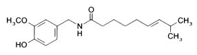 Capsaicin s, Alkaloid [(E)-N-Vanillyl-8-methyl-6-noenamid] aus den Früchten von Capsicum-Arten (0,3–0,5% der Inhaltsstoffe, z. B. in Paprika und Chili), deren scharfen, brennenden Geschmack es verursacht. Capsaicin ist noch in einer Verdünnung von 1:105 zu spüren. Seine Wirkung ist auf die Aktivierung eines Ionenkanals (Capsaicin-Rezeptor) auf der Oberfläche von Neuronen zurückzuführen ( vgl. Infobox ). Capsaicin ( vgl. Abb. ) wird gelegentlich in alkoholischer Lösung für hyperämisierende Einreibungen gegen Frostbeulen, Gliederreißen, bei diabetischer Polyneuropathie und Rheumatismus verwendet, vermutlich, da die Schmerzrezeptoren (Nozizeptoren, Schmerz) durch die Capsaicineinwirkung mit der Zeit unempfindlich gemacht werden. – Capsaicin hat sich außerdem als ebenso wirksames wie umweltfreundliches Mittel erwiesen, Schiffsrümpfe vor der Besiedlung durch Meeresbewohner (Seepocken, Muscheln usw.) zu schützen. Epoxidlacke, die mit Balsamen aus dem besonders scharfen Cayenne- bzw. Habanero-Pfeffer versetzt sind, behalten ihre abschreckende Wirkung über mehrere Jahre hinweg.