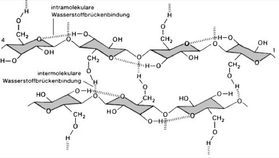 2 Ausschnitt aus der Strukturformel zweier paralleler Ketten unter Berücksichtigung von Wasserstoffbrückenbindungen und Orientierung der einzelnen Zuckerringe zueinander. Man beachte die alternierende 180°-Drehung der einzelnen Glucosereste, wobei jedoch, stabilisiert durch die intramolekularen Wasserstoffbrücken, eine annähernd brettartige Struktur der einzelnen Ketten resultiert.