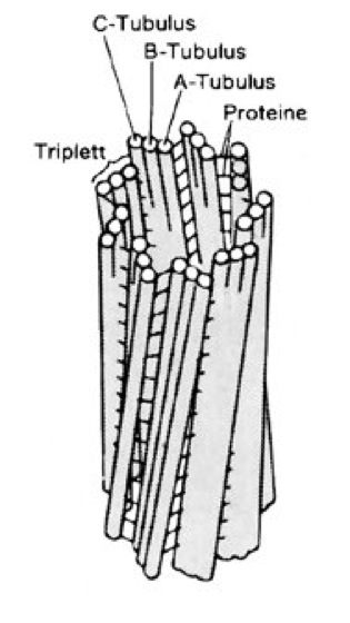 Schematische Darstellung eines Centriols mit dem charakteristischen Aufbau aus 9 peripheren Tripletts. Jedes Triplett besteht aus einem vollständigen Mikrotubulus (A-Tubulus) und zwei nicht vollständig ausgebildeten Tubuli, dem B-Tubulus und C-Tubulus. Untereinander sind die Tripletts durch besondere Proteine verbunden. Ein Centriol hat eine Länge von 0,3–0,5 μm und einen Durchmesser von 0,15 μm; der Durchmesser eines Mikrotubulus beträgt etwa 20 nm.
