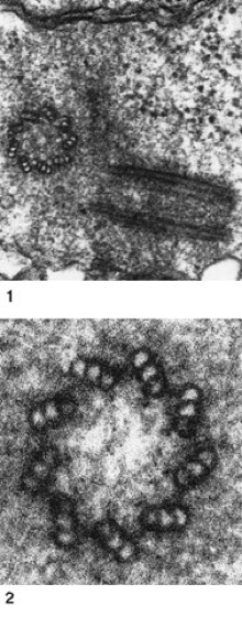 EM-Aufnahmen von Centriolen. 1 Centriolenpaar (Diplosom) in Lymphocyten der Maus; aufgrund der stets zueinander senkrechten Lagebeziehung der beiden Centriole ist das eine (links) im Querschnitt, das andere im Längsschnitt getroffen. 2 Vergrößerte Querschnittansicht eines Centriols, die die Verbindungen zwischen äußerem und innerem Tubulus benachbarter Tripletts erkennbar macht.