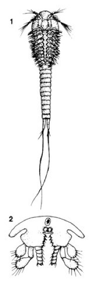 1 Hutchinsoniella macracantha von ventral (von unten); 2 Querschnitt durch ein Thorakalsegment mit den seitlichen Epimeren und den Spaltfüßen, die eine Nahrungsrinne begrenzen.