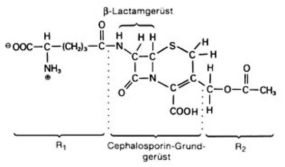 Die einzelnen Cephalosporinderivate unterscheiden sich in den Resten R1 und R2.
