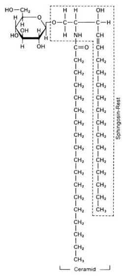 Cerebroside [von *cerebr -], Zerebroside,Glykolipide, die sich vom Aminoalkohol Sphingosin durch Acylierung der Aminogruppe mit einem Fettsäurerest (Ceramide) und Glykosylierung der Hydroxylgruppe mit Glucose oder Galactose ableiten ( vgl. Abb. ). Durch Einfügung weiterer Zuckerreste an Glucose bzw. Galactose bilden sich aus Cerebrosiden die Ganglioside. Cerebroside sind als phosphorfreie Lipoide charakteristische Bestandteile von Membransystemen (Membran) der Nervenzellen und der weißen Substanz des Gehirns (11% des Trockengewichts).