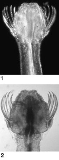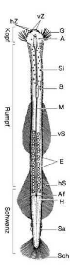 Chaetognatha [von *chaeto –, griech. gnathos = der Kiefer], Borstenkiefer, Pfeilwürmer, Homalopterygia, artenarmer Stamm wirbelloser Coelomaten von meist geringer Größe (6 bis etwa 100 mm). Sie leben ausschließlich im Meer, in der großen Mehrzahl als pelagische Beutejäger. In allen Weltmeeren verbreitet, treten sie häufig in solchen Massen auf (5–10% der marinen Biomasse), daß sie eine bedeutende Rolle in der Nahrungskette des marinen Ökosystems spielen. Die Tiere, deutsch treffend als Pfeilwürmer bezeichnet, sind glasklar durchsichtig und von schlanker, fischähnlicher Gestalt. Ihr bilateralsymmetrischer Körper gliedert sich in einen muskulösen, mit Greifhaken bewehrten Kopf (wissenschaftlicher Name; vgl. Abb. ), von diesem durch einen kurzen Hals abgesetzt einen schlanken Rumpf von quer-ovalem Querschnitt und einen kurzen, in einer fächerförmigen waagerechten Schwanzflosse endenden Schwanzabschnitt. Zusätzlich zur Schwanzflosse sind an den Rumpfflanken 1–2 Paar schmaler Seitenflossen ausgebildet. Alle Flossen sind selbst unbeweglich und bestehen aus einfachen Cuticula-überzogenen Epithelfalten, die zusätzlich durch starre cuticuläre Radien versteift sind. Sie dienen den gewöhnlich reglos im Wasser schwebenden Tieren ebenso als Lagestabilisatoren und Schwebefortsätze wie als Ruder (Schwanz) und Leitflächen, wenn diese etwa zu Beutefang oder Flucht durch rasche vibrierende Rumpfbewegungen pfeilschnell vorwärts schießen oder durch langsames Schlängeln in der Dorsoventralebene aktive tagesrhythmische Vertikalwanderungen unternehmen. Der Beutefangapparat der Pfeilwürmer besteht aus zwei Reihen scharfer Zahnleisten an den Kopfseiten ventrolateral der Mundöffnung und, beidseits hinter diesen, je einer Gruppe von 7–14 langen, spitzen Greifhaken aus Chitin, die durch kräftige Muskeln wie Baggerschaufeln geöffnet und abgespreizt und blitzschnell vor dem Mund zusammengeschlagen werden können. In Ruhestellung werden sie seitlich dem Kopf angelegt und unter einer kapuzenartigen Hautfalte (Praeputium) verborgen (Verringerung des Schwimmwiderstands). Verschiedene Drüsengruppen rund um das Mundfeld sondern ein starkes Nervengift (Tetrodotoxin) ab, das die mit den Greifhaken erfaßten und verletzten Beutetiere augenblicklich lähmt. Als Nahrung dienen Planktonorganismen zum Teil erheblicher Größe, besonders Fischlarven und Krebschen. Bisher sind etwa 120 Arten bekannt, die sich auf 2 Ordnungen (Phragmophora und Aphragmophora) mit insgesamt etwa 10 Gattungen verteilen ( vgl. Tab. ), unter ihnen eine einzige zu benthischer Lebensweise übergegangene und an allen europäischen Küsten verbreitete Form (Spadella). In allen Meeren überaus häufig, zeigen manche Arten aber eine ausgeprägte Präferenz für bestimmte Salzgehalts-, Temperatur- oder Tiefenzonen. Da sie als Planktonten passiv mit Meeresströmungen verfrachtet werden, dienen sie in der Ozeanographie häufig als Indikatororganismen zum Nachweis großräumiger Wasserbewegungen. Die Gattung Sagitta ist weltweit verbreitet und umfaßt etwa 65% aller bekannten Arten. Anatomie ( vgl. Abb. ): Das Integument besteht aus einer zellulären, meist mehrschichtigen Epidermis – eine für Wirbellose ungewöhnliche Epithelform, die eher an die Körperbedeckung der Chordatiere erinnert; nur in einzelnen eng begrenzten Körperbereichen (ventrale Kopfseite, Praeputium und Flossen) ist die Epidermis einschichtig. Die gesamte Körperoberfläche ist von einer dünnen, zähen Gallertschicht überzogen; nur an Kopfunterseite und Flossen ist diese zu einer derberen Cuticula verdickt. Die Leibeshöhle stellt ein echtes Coelom dar und wird von einem lückenhaften, begeißelten Coelothel ausgekleidet, aus dem sich auch die Muskulatur differenziert. Zwischen Coelothel und Epidermis liegt eine derbe Basalmembran. Quersepten gliedern die Körperhöhle der äußeren Körpergliederung entsprechend in drei Abschnitte, ein rudimentäres, von Muskulatur und Nervensystem fast verdrängtes Kopfcoelom, das sich auch in das Praeputium hinein erstreckt, ein weiträumiges Rumpf- und ein kurzes Schwanzcoelom. Sonstige Anzeichen einer Segmentierung fehlen. Die Rumpfmuskulatur beschränkt sich auf je zwei dorsale und ventrale Längsmuskelstränge und, bei der ursprünglicheren Ordnung der Phragmophora, eine transversale Muskellage zwischen den ventralen Längsmuskeln, die bei den Aphragmophora (Name!) fehlt. Aus dem Coelothel entstehen beim erwachsenen Tier auch Umhüllung und Ausleitungsgänge der zwittrigen sackförmigen Gonaden, der das Rumpfcoelom teilweise ausfüllenden paarigen Ovarien und der Hoden im Schwanzcoelom. Der Darm durchzieht die Leibeshöhle als gerades, abgesehen von mehreren seitlichen Blindtaschen in der Oesophagusregion wenig gegliedertes Epithelrohr und mündet unmittelbar vor dem Septum des Schwanzcoeloms ventral nach außen. Er ist von einem dünnen Muskelmantel umkleidet und durch je ein ventrales und dorsales Mesenterium an der Körperwand festgeheftet. Durch diese Mesenterien wird das Rumpfcoelom unvollständig in ein rechtes und linkes Fach geteilt. Ein Blutgefäßsystem fehlt ebenso wie anscheinend auch ein eigenes Exkretionssystem, wenngleich paarige cilienbesetzte Gruben in der Nackenregion und eine daran anschließende drüsenreiche Wimpernrinne (Corona ciliata) von manchen Autoren als Exkretionsorgan gedeutet werden. Vermutlich werden der Nähr- und Exkretstofftransport im Körper und die Umwälzung der Coelomflüssigkeit vom Cilienbesatz des Coelothels unterhalten. Das Nerven- und Sinnessystem ist entsprechend der planktonisch räuberischen Lebensweise wohlausgebildet. Es besteht aus einem großen unpaaren Gehirn (Cerebralganglion) über dem Mund, mit diesem über seitliche Kommissuren verbundenen paarigen Vestibularganglien mit dorsal diesen aufsitzenden Oesophagealganglien beidseits des Oesophagus und einem mächtigen unpaaren Ventralganglion im vorderen Drittel der Bauchwand, das durch paarige Nervenstränge mi
