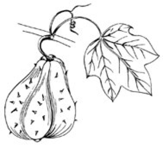 Chayote w [über span. chayote = Stachelgurke], Sechium edule, Chayota edulis, Stachelgurke, ursprünglich in Brasilien heimisches Kürbisgewächs; einzige Art der Gattung Sechium. Mit Blattranken kletternde, über 10 m lange Sprosse bildende, ausdauernde Pflanze mit breiten, kantigen Blättern und kleinen, cremefarbenen, diözischen Blüten. Der unterständige Fruchtknoten wird zu einer bis 1 kg schweren, 15 cm langen, grünen oder weißlichen birnenförmigen, weich bestachelten Frucht ( vgl. Abb. ), die nur einen einzigen, harten, bis zu 10 cm langen flach-ovalen Samen enthält. Dieser keimt in der Frucht, die sich an der Spitze öffnet, um dem Keimling den Austritt zu ermöglichen. Die Wurzel wird zu einer Rübe, deren Oberteil sich zu einer breiten Scheibe mit zahlreichen Knospen entwickelt, die in den folgenden Jahren zu Sprossen auswachsen. Rübenbürtige Seitenwurzeln verdicken sich an ihrer Spitze zu yamswurzelartigen Knollen, die bis zu 10 kg schwer werden und ca. 20% Stärke enthalten. Die Pflanze, deren Wildform heute unbekannt ist, war bereits den Azteken bekannt und wird heute außer im tropischen und subtropischen Amerika auch in Nord- und Westafrika und im Mittelmeergebiet kultiviert. Sowohl die lange haltbaren Früchte als auch die jungen Triebe und die Wurzelknollen werden als Gemüse verzehrt oder als Viehfutter verwendet (Inhaltsstoffe vgl. Tab. ). Die leichten, biegsamen Fasern der Sproßachse dienen zur Herstellung von Hüten und Matten.