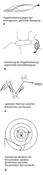 Chemotaxis w [von *chemo –, griech. taxis = Anordnung; Adj. chemotaktisch], die Eigenschaft freibeweglicher Organismen, auf chemische Stoffe bzw. deren Konzentrationsunterschiede durch bestimmte, gerichtete Bewegung zu reagieren. Entweder findet Anlockung (positive Chemotaxis) oder Abstoßung (negative Chemotaxis) statt. Positive Chemotaxis auslösende Stoffe werden als Attraktantien (Attractants), negative Chemotaxis auslösende Stoffe als Repellantien (Repellents) bezeichnet. Beispielsweise reagieren Bakterien positiv chemotaktisch auf Aminosäuren, bestimmte Zucker, wie Glucose, und auf Sauerstoff (Aerotaxis) und negativ chemotaktisch auf zahlreiche Zellgifte (Cytotoxine), z. B. Phenol. Bei den männlichen Gameten der Farne führen Apfelsäure und deren Salze zu einer positiven Chemotaxis, durch welche die Gameten in den Hals der Archegonien (Archegonium) gelockt werden. Die Anhäufung weißer Blutkörperchen (Eiter, Leukocyten) an Entzündungsstellen (Entzündung) beruht auf positiver Chemotaxis durch bestimmte im Entzündungsherd gebildete, als Attraktantien wirkende Stoffe (z. B. Bakterientoxine). – Zum Mechanismus und Chemismus der Chemotaxis bei Bakterien: vgl. Infoboxvgl. Abb. ) rotieren die Flagellen (Bakteriengeißel, Abb.) während des Schwimmens gegen den Uhrzeigersinn und bilden dabei ein Bündel, das wie ein Propeller arbeitet, um ein gleichmäßiges Schwimmen zu erzeugen (Abb. 1a). Rotieren die Flagellen jedoch im Uhrzeigersinn, "fliegen" sie auseinander und bewirken ein chaotisches Taumeln (Abb. 1b). In Abwesenheit eines chemotaktischen Signals kommt es immer wieder zu zufälligen Umkehrungen der Flagellenrotation. Deshalb wird das gleichmäßige Schwimmen durch kurze, spontane Taumelbewegungen unterbrochen, wodurch sich die Schwimmrichtung zufällig ändert (Abb. 1c). In Gegenwart eines chemotaktischen Lockstoffs wird diese Umkehrung unterdrückt. Wenn das Bakterium sich auf den Lockstoff zubewegt, schwimmt es also gerade; wenn es abweicht und die Konzentration des Lockstoffs wieder abnimmt, treten die Taumelbewegungen wieder auf (Abb. 1d). Die Chemotaxis beruht also nicht auf der Wahrnehmung eines Konzentrationsgradienten über die Zelle hinweg (dazu sind die Bakterienzellen viel zu klein), sondern auf einer verringerten Taumelwahrscheinlichkeit bei steigender Konzentration des Lockstoffs.
