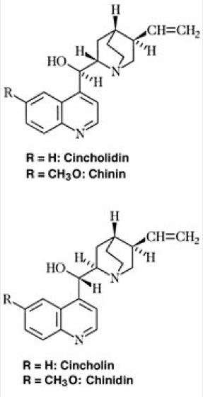 Chinaalkaloide [von Chinarinde], Chinarindenalkaloide, Cinchonaalkaloide, eine Gruppe von Alkaloiden mit Chinolinringsystem ( vgl. Abb. ), die sich neben Chinasäure, Gerbsäure und β-Sitosterin in der Chinarinde (Rinde verschiedener Arten der Gattung Cinchona;Chinarindenbaum) finden, eines altindianischen Mittels gegen Fieber, das in der 1. Hälfte des 17. Jahrhunderts von Südamerika nach Europa gebracht wurde. In industriell verwerteten Rinden besonderer Zuchtformen kann der Gesamtalkaloidgehalt bis zu 17% betragen. Insgesamt wurden über 25 Alkaloide aus Chinarinde isoliert. Hauptalkaloide sind Chinin (5–7%) und sein Diastereoisomeres, das Chinidin (0–4%), sowie Cinchonin (2–8%; als erstes Chinaalkaloid 1810 von Gomes aus Chinarinde isoliert) und sein Diastereoisomeres, das Cinchonidin (1–8%). Die Biosynthese der Chinarindenalkaloide erfolgt aus Tryptophan und einem Monoterpen. Chinin wird in Form seines Hydrochlorids als Antimalariamittel verwendet; es ist als Schizontenmittel wirksam. Auch als Antimalariamittel wirken die basisch substituierten Chinolinderivate, wie Chloroquin und Primaquin. Die Wirkung des Chinins als Antipyretikum ist verhältnismäßig schwach; es ist ein Zellgift. Chinidin hat im Prinzip die gleichen Wirkungen wie Chinin, aber einen geringeren chemotherapeutischen Effekt. Die Wirkung auf das Herz ist dagegen stärker ausgeprägt; es wird deshalb als Antiarrhythmikum angewendet. Wegen zunehmender Resistenzentwicklung sind z. B. Mefloquin und Halofantrin eingeführt worden. Chinolinalkaloide, Skraup (Z.H.).