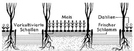 Querschnitt durch eine Chinampa und die sie umgebenden Kanäle
