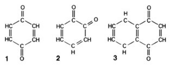 Chinone, Sammelbezeichnung für cyclische Dicarbonylverbindungen, die sich vom Grundgerüst des o- oder p-Benzochinons ableiten (Benzochinone; vgl. Abb. ); gekennzeichnet durch ihre gelbe bis rote Farbe und ihre Reduzierbarkeit zu den entsprechenden Semichinonen und Hydrochinonen. Ihre Bezeichnungen leiten sich von dem jeweils zugrundeliegenden aromatischen System ab. Neben Benzochinonen unterscheidet man u. a. Naphthochinone, Anthrachinone und Phenanthrenchinone. Etwa 170 verschiedene Chinone wurden aus Pilzen und Blütenpflanzen isoliert. Chinone von besonderer biologischer Bedeutung sind die Flavinnucleotide (FMN [Flavinmononucleotid], FAD [Flavinadenindinucleotid]), das Plastochinon und das Ubichinon. Auch die Vitamine E (Tocopherol) und K (Phyllochinon) gehören zu den Chinonen. Viele Chinone wirken als Bakterizide oder Fungizide. In der Cuticula der Arthropoden werden Proteine mit Chinonen gegerbt. Chinone wurden auch in den Wehrsekreten von Insekten gefunden (Benzochinon und Toluchinon). Chinoide Systeme bilden das Grundchromophor zahlreicher synthetischer und natürlich vorkommender Farbstoffe, der Chinonfarbstoffe, z. B. der Anthrachinonfarbstoffe (Anthrachinon) und der Alizarinfarbstoffe (Alizarin). Allelopathie, Armstrong (H.E.), Atmungskette, Bombardierkäfer, Chinon-Hydrochinon-Zyklus, Graebe (C.), Photosynthese.