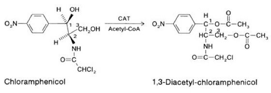 Aus der Reaktion mit Acetyl-CoA entsteht hauptsächlich 3-Acetyl-Chloramphenicol. Das Diacetyl-Derivat wird um 2 Größenordnungen langsamer als die Monoacetyl-Verbindung gebildet.