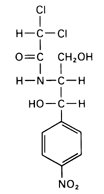 Chloramphenicols, Chloromycetin, ein zuerst in Streptomyces venezuelae gefundenes Antibiotikum (Antibiotika, Tab.), das die an 70S-Ribosomen prokaryotischer Organismen ablaufende Proteinsynthese hemmt, beruhend auf einer durch Bindung an die ribosomale 50S-Untereinheit verursachten Inhibition des Translokations-Schritts während der Elongationsphase des Translations-Prozesses (Ribosomen). Bei Eukaryoten hemmt Chloramphenicol die Proteinsynthese in den Mitochondrien oder Chloroplasten, die an Ribosomen vom prokaryotischen Typ (70S) gekoppelt ist, nicht aber die Proteinsynthese an den 80S-Ribosomen des Cytoplasmas. Chloramphenicol enthält die in Biomolekülen sonst sehr selten beobachteten Chloratome (Chlor) bzw. die Nitrogruppe ( vgl. Abb. ). Das heute synthetisch hergestellte Chloramphenicol ist von klinischer Bedeutung bei Lungeninfektionen, Meningitis, Cholera, Amöbenruhr und Bakterienruhr (Shigellose) und besonders bei Typhus. Resistenz entsteht in erster Linie nach enzymatischer Acetylierung von Chloramphenicol (Chloramphenicol-Acetyl-Transferase) zu einem Acetoxy-Derivat, das nicht mehr an Ribosomen binden kann. Weitere Resistenzmechanismen beruhen auf den Fähigkeiten der Zellen, Chloramphenicol aus den Zellen zu transportieren, resistente Ribosomen zu produzieren oder die Aufnahme in die Zellen zu erschweren. Plasmid-Amplifikation, ribosomale RNA.