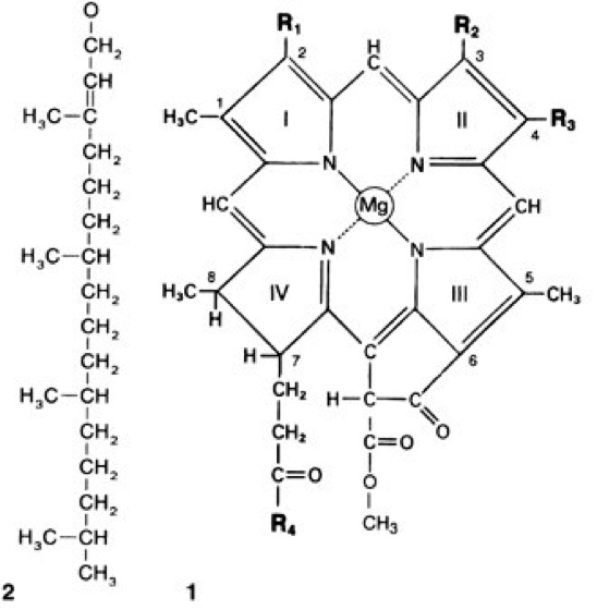 Chlorophylle [von *chloro –, griech. phyllon = Blatt], Blattgrün, die grünen, in isolierter Form rötlich fluoreszierenden Farbstoffe (Pflanzenfarbstoffe, Blattfarbstoffe) der grünen Pflanzen und photosynthetisierenden Algen und bestimmter Bakterien (Bakteriochlorophylle). Chlorophylle leiten sich vom Porphyringerüst (Porphyrine) ab ( vgl. Abb.vgl. Tab. ) die Struktur der Chlorophylle a, b, c1, c2 und d ablesen. Alle "echten" Chlorophylle außer c1 und c2 – deren Struktur erst in den letzten Jahren aufgeklärt werden konnte – weisen den charakteristischen Phytolrest (2) auf. Die unterschiedliche Lichtabsorption der Chlorophylle (Absorptionsspektren: Bakteriochlorophylle) ist durch verschiedene Seitenketten, Verschiedenheiten einzelner Bindungen (gesättigt, ungesättigt) sowie verschiedenartige Veresterungen und Bindungen an Proteine bedingt. Die Lichtabsorption der "echten" Chlorophylle liegt hauptsächlich im blauen und roten Spektralbereich; die Bakteriochlorophylle absorbieren auch im nahen Infrarot.