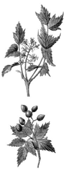 Ähriges Christophskraut (Actaea spicata), oben Blütenzweig, unten Fruchtzweig