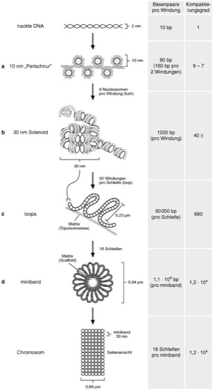 Schematische Darstellung der Chromatinorganisation. Gezeigt sind die vier wesentlichen Ebenen der Verpackung der DNA im Zellkern: a Nucleosomen, b30 nm-Solenoide, c "Chromatin-loops" und d "minibands".