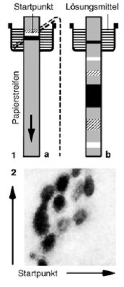 Chromatographie w [von *chromato –, griech. graphē = Schrift], Sammelbegriff für physikalisch-chemische Trennmethoden, mit denen Substanzgemische aufgrund der verschiedenen Verteilung ihrer einzelnen Komponenten zwischen einer unbeweglichen (stationären) und einer beweglichen (mobilen) Phase aufgetrennt werden. Chromatographische Methoden werden sowohl zur präparativen (im Bereich von mMol oder einigen Mol der aufzutrennenden Stoffe) als auch zur analytischen (bis zum Nano- und Picomolbereich) Trennung von Stoffgemischen eingesetzt. Die Bezeichnung Chromatographie wurde geprägt durch die ursprünglich zur Trennung von Farbstoffen (chroma, griech. = Farbe) entwickelte Adsorptionschromatographie. Durch Anwendung empfindlicher Nachweismethoden für farblose Stoffe wurden chromatographische Methoden rasch zur Trennung praktisch aller (d. h. auch der farblosen) Substanzklassen ausgedehnt. Die Bedeutung der Chromatographie für fast alle Bereiche der Biologie, besonders aber für Biochemie, Molekularbiologie und Physiologie, ist heute kaum zu überschätzen. – Die beiden wesentlichen Trennprinzipien definieren sich nach der mobilen Phase: bei der Flüssigkeitschromatographie werden gelöste Substanzen in organischen Lösungsmitteln oder wäßrigen Salzlösungen aufgetrennt, bei der Gaschromatographie Gase oder flüchtige Substanzen mittels inerter Trägergase. Die stationären Phasen sind entweder flächenförmig (Papierchromatographie, Dünnschichtchromatographie;vgl. Abb. ) oder säulenförmig (Säulenchromatographie), wobei im Falle der Dünnschichtchromatographie (thin layer chromatography) die stationären Phasen in Form dünner Schichten (0,1–1 mm) auf Glasplatten oder Kunststoffolien aufgezogen sind. Bei der Säulenchromatographie sind sie innerhalb von Glasrohren (bzw. Stahlrohren bei Hochleistungs-Flüssigkeits-Chromatographie;HPLC) als "Säulen" (Durchmesser 0,1–5 cm, Länge 1–100 cm), die von den betreffenden mobilen Phasen in der Längsrichtung durchflossen werden können, eingebettet. Die stationären Phasen bestehen meist aus festen Stoffen, den Trägerstoffen, die selbst oft adsorptive Eigenschaften haben (Adsorbentien), u. a. Papier, Biopolymere wie Cellulose, Stärke, Dextrane oder Agarose (Agar), synthetische Polymere wie Polyacrylamid, Methacrylate oder Polyvinylbenzol/Polystyrol sowie anorganische Polymere wie Kieselgel, Hydroxylapatit oder poröse Glaskügelchen. Im Falle der Verteilungschromatographie fungiert als stationäre Phase ein an der Oberfläche eines festen Stoffes adsorbiertes Lösungsmittel (z. B. Methanol an Aluminiumoxid), so daß die eigentliche chromatographisch wirksame Schicht der stationären Phase flüssig ist. Mit der Einführung funktioneller Gruppen bzw. Liganden wird der Trennmodus eingeengt; z. B. bilden hydrophobe/lipophile Liganden die Grundlage für die hydrophobe Interaktionschromatographie und die Umkehrphasenchromatographie, ionische Gruppen für die Ionenaustauschchromatographie, Metallionen für die Metallchelat-Affinitätschromatographie. – Zur Durchführung einer Chromatographie werden die gelösten Substanzgemische zunächst an dem dem späteren Einfließen der mobilen Phase zugewandten Ende der stationären Phase (meist oberes Ende bei Säulen- und Papierchromatographie, da Laufrichtung der mobilen Phase von oben nach unten; unteres Ende bei Dünnschichtchromatographie, da Laufrichtung von unten nach oben) aufgetragen. Anschließend erfolgt die Auftrennung der Gemische aufgrund des Durchströmens der mobilen Phase. Dabei werden die einzelnen Komponenten, je nach relativer Verweilzeit in der stationären bzw. mobilen Phase, unterschiedlich weit von der mobilen Phase "mitgeschleppt", so daß sie, bei Dünnschicht- und Papierchromatographie, nach Beendigung der Chromatographie an unterschiedliche Positionen der Schicht bzw. des Papiers zu stehen kommen bzw. bei Säulenchromatographie in charakteristischer Reihenfolge am unteren Ende der Säule in gelöster Form die stationäre Phase verlassen (d. h. eluiert werden; eluieren). Die Methoden der Dünnschicht- und Papierchromatographie werden häufig auch in der zweidimensionalen Form eingesetzt (zweite Laufrichtung senkrecht zur ersten Laufrichtung sowie anderes Lösungsmittel). Vor allem bei der Säulenchromatographie nutzt man inzwischen verstärkt unterschiedliche Lösungsmittelzusammensetzungen, Gradienten genannt, zur Auftrennung. Der Gradient kann linear oder als Stufengradient angelegt werden und u. a. den pH-Wert, den Salzgehalt oder den Gehalt an organischem Lösungsmittel betreffen. Bleibt das Lösungsmittel gleich, spricht man von isokratischer Trennung. Für die Beurteilung der chromatographischen Auftrennung ist die Detektion der untersuchten Substanzen wesentlich. Die spezifische Detektion z. B. durch enzymatische, hormonelle oder rezeptorspezifische Funktionstests oder immunologische Methoden erlaubt den gezielten, qualitativen Nachweis bekannter Substanzen. Die unspezifische Detektion dient der quantitativen Erfassung von Substanzen, z. B. des Proteingehalts mit Hilfe von UV-Absorption oder Farbreaktionen (Bradford-Methode, Lowry-Methode oder Bicinchoninsäure-Assay; Proteinbestimmung) oder des Gasgehalts durch Änderungen der Wärmeleitfähigkeit. Ein Chromatogramm ( vgl. Infobox ) bezeichnet die graphische Darstellung des von den Detektoren aufgezeichneten Signals als Konzentrationsmaß gegen die Zeit, im Fall von Dünnschicht- und Papierchromatographie die Fixierung der aufgetrennten Komponenten auf der Schicht. Die meisten Komponenten chromatographischer Systeme werden inzwischen automatisch gesteuert (z. B. automatische Probengeber [Autosampler] und Fraktionssammler) und per Computer reguliert (z. B. Regelung der Durchflußgeschwindigkeit oder Aufbau von Gradienten). Die quantitative Auswertung von Detektorsignalen sowie die qualitative Analyse (z. B. nach zweidimensionaler Auftrennung) erfolgen ebenfalls meist computergestützt. Methoden der Chromatogra