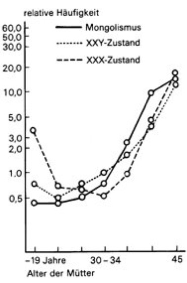 Chromosomenanomalien [von *chromosom –, griech. anōmalia = Ungleichheit], Veränderungen in der Zahl (numerische Chromosomenanomalien, Genommutationen) oder Struktur (strukturelle Chromosomenanomalien, Chromosomenaberrationen, Chromosomenmutationen) der Chromosomen (Mutation), die sich als Komplex von Defekten äußern können und beim Menschen Ursache einer Reihe von klinischen Syndromen darstellen. – Zu den numerischen Chromosomenanomalien, d. h. Abweichungen im Gesamtbestand der Chromosomen, gehören Aneuploidie (einzelne Chromosomen sind überzählig oder fehlen in allen Zellen des Organismus; bei Diplonten z. B. Monosomie, Trisomie oder Nullisomie), Mosaikbildung (Mosaikbastard), Endopolyploidie (Vervielfachung des Chromosomensatzes in bestimmten Geweben) und Euploidie (Vervielfachung oder Reduzierung kompletter Chromosomensätze in allen Zellen des Organismus). Die Vervielfachung des Chromosomensatzes (Polyploidie) kommt im Pflanzenreich häufig vor und scheint in der Evolution der Pflanzen eine große Rolle zu spielen. Polyploide Individuen sind äußerlich weniger auffällig als aneuploide; ein zusätzliches oder fehlendes Chromosom stört das genetische Gleichgewicht mehr als ein zusätzlicher Chromosomensatz. Im Tierreich treten sehr selten polyploide Lebewesen auf, beim Menschen ist Polyploidie letal. Schätzungsweise jeder zweite Abort (Abortus) beim Menschen wird auf eine Chromosomenanomalie zurückgeführt. Nicht letale und phänotypisch erkennbare numerische Chromosomenanomalien des Menschen sind zum einen die Monosomie des X-Chromosoms (X0-Situation), die zum Turner-Syndrom führt (Monosomien der Autosomen sind letal) und wahrscheinlich durch zufälligen Chromosomenverlust in den postmeiotischen Teilungen der Gameten entsteht. Zum anderen kennt man eine Reihe von Trisomien ( vgl. Abb. ), die durch non-disjunction in der der Gametenbildung vorausgehenden Meiose entstehen: In Bezug auf die Geschlechtschromosomen sind der XXY-Status, der zum Klinefelter-Syndrom führt, der XXX-Status, der allerdings nur geringfügige phänotypische Veränderungen bewirkt, sowie der XYY-Status (den Betroffenen wurde früher Neigung zu Gewalttätigkeiten zugeschrieben, was heute aber als widerlegt gilt) bekannt. Solche Störungen der Verteilung der Geschlechtschromosomen führen zu Entwicklungsstörungen und beeinflussen Körpergröße und Fertilität. Bei den Autosomen sind die Trisomie (Hyperploidie) des Chromosoms Nr. 21 (Trisomie 21), die zum Down-Syndrom führt (häufigste Chromosomenanomalie, Häufigkeit von 1 : 600–700 Lebendgeborenen, durchschnittliche Lebenserwartung heute ca. 30 Jahre), sowie die Trisomie der Chromosomen 18 bzw. 13 zu nennen, die das Edwards-Syndrom bzw. Patau-Syndrom zur Folge haben (Häufigkeit von 1 : 5000 Lebendgeborenen, die Hälfte der Betroffenen stirbt innerhalb des ersten Vierteljahres). Das überzählige Chromosom eines trisomen Organismus kann vom Vater oder von der Mutter stammen. Die Häufigkeit der Trisomien steigt bei Schwangeren über 35 Jahre an, bei jüngeren Müttern unterbricht wahrscheinlich häufiger ein Abort eine derartige Schwangerschaft. Theoretisch kann jedes Chromosom eines Genoms überzählig sein. Beim Menschen treten die meisten Trisomien der anderen Chromosomen jedoch nicht in Erscheinung, da sie zum Abort führen. Bei einigen Pflanzen ist es dagegen gelungen, den vollständigen Chromosomensatz trisomer in Organismen zu etablieren, z. B. bei der Tomate und der Gerste. In der Pflanzenzüchtung werden in sog. Additionslinien fremde, überzählige Chromosomen zugefügt (z. B. hexaploide Weizensorten mit Roggenchromosomen), in Substitutionslinien werden Einzelchromosomen durch Chromosomen fremder Arten ersetzt. Des weiteren werden beim Menschen auch Chromosomenmosaike gebildet; z. B. können durch non-disjunction in der Mitose hinsichtlich ihrer Chromosomenzahl unterschiedliche Zellinien innerhalb eines Organismus entstehen. So werden XX/XY-, XXY/XX- oder XXY/XY/X0-Mosaike genauso gefunden wie Mosaike aus Zellen mit Trisomie 21 und normalen Zellen. – Strukturelle Chromosomenanomalien umfassen Defizienzen, Deletionen, Duplikationen, Ringchromosomenbildung und Translokationen (Chromosomenaberrationen). Chromosomendiagnostik, Down (J.L.H.), Erbdiagnose, Strahlenschäden.