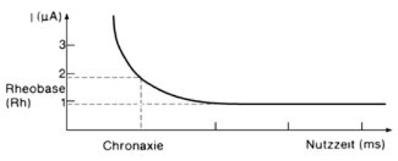 Chronaxie w [von *chron –, griech. axia = Wert], Kennzeit, Zeitmaß für die elektrische Erregbarkeit einer Zelle. Um die Erregung einer Zelle (Nerven-, Muskel- oder Sinneszelle) auszulösen (elektrische Reizung), muß der angelegte Strom nicht nur eine bestimmte Stärke I bzw. die mit ihr proportionale Spannung U besitzen, sondern auch eine bestimmte Mindestzeit t (sog. Nutzzeit) fließen. Dabei ist die Dauer der Nutzzeit umgekehrt proportional der Stromstärke I. Bezeichnet man die geringste Stromstärke, die bei beliebig langer Reizdauer (Reiz) gerade noch eine Erregung auszulösen vermag, als Rheobase Rh, so gilt die Beziehung: (I–Rh) · t = constant (Weiss-Hoorwegsches Reizgesetz). Die zum doppelten Rheobasewert ( vgl. Abb. ) gehörende Zeit wird nach L. Lapicque als Chronaxie bezeichnet und stellt eine charakteristische Kenngröße verschiedener Zellen und Gewebe dar, insbesondere von Nerven und Muskeln ( vgl. Tab. ). In der Neurologie wird die Bestimmung der Chronaxie hauptsächlich zur Diagnose und Verlaufskontrolle von Muskellähmungen und Nervenschädigungen eingesetzt. Durch Anlegen von Hautelektroden über einen bestimmten Nerv wird durch Stromapplikation zunächst die Rheobase bestimmt. Der Reizerfolg wird dabei durch die Zuckung des vom gereizten Nerv innervierten Muskels angezeigt. Bei Durchtrennung, Erkrankung von motorischen Nerven oder schweren Lähmungen kann die Chronaxie auf den 10fachen Wert ansteigen. Impuls.