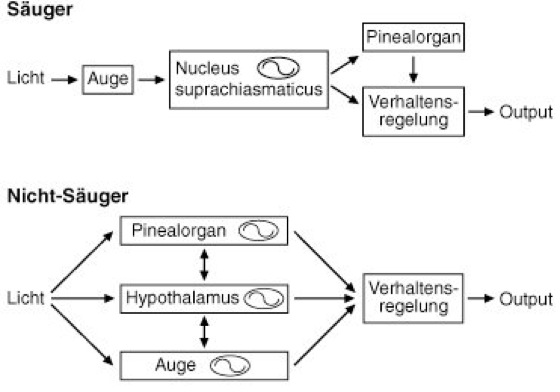 Da die circadiane Rhythmik eine Systemeigenschaft der Zelle ist, müssen in Vielzellern (Metazoa) die einzelnen Zellen, Gewebe und Organe zur endogenen Rhythmik des Organismus synchronisiert werden. Die in den Blattbewegungen (z. T. auch Blütenbewegungen) von Pflanzen ( vgl. Abb. 2) oder der Lauf-Aktivität von Tieren zum Ausdruck kommende circadiane Periodik beruht entweder auf einer Interaktion vieler Oszillatoren zu einer gemeinsamen Frequenz oder auf der Schrittmacherfunktion bestimmter Zellen oder Gewebe. Gerade bei tierischen Systemen findet sich häufig ein zentral-nervös lokalisierter Schrittmacher (Nucleus suprachiasmaticus,Pinealorgan; vgl. Abb. 3). Beim Ausfall des übergeordneten Schrittmachers können einzelne Gewebe oder Organe eine eigene Periodizität ausprägen und zu einer Desynchronisation der zeitlichen Organisation des Lebewesens führen, die unter Umständen den Zusammenbruch des Organismus zur Folge hat.