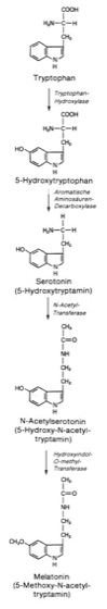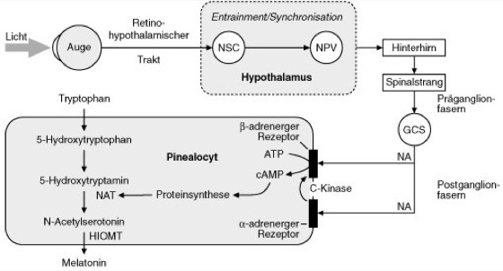 Bei Wirbeltieren kommt dem Pinealorgan eine zentrale Bedeutung bei der Übersetzung von photoperiodischen Signalen in eine Umsteuerung des Stoffwechsels zu ( vgl. Abb. 4). Bei Niederen Wirbeltieren, wie Fischen, Amphibien und Reptilien, ist das Pinealorgan vorwiegend Photorezeptor, dessen elektrische Aktivität in Abhängigkeit von der Belichtung wechselt. Bei Vögeln zeigt das Pinealorgan eine circadiane Rhythmik, ist Photorezeptor und kontrolliert höchstwahrscheinlich die Bewegungsaktivität und die Körpertemperatur durch die Sekretion des Hormons Melatonin. Bei Säugetieren ist das Pinealorgan (Epiphyse, Zirbeldrüse) eine Drüse, die nicht auf direkte Beleuchtung reagiert, jedoch über Signale, die von den Augen kommen, gesteuert wird. Die Produktion von Melatonin wird über eine Rhythmik des Schlüsselenzyms N-Acetyl-Transferase geregelt ( vgl. Abb. 5). Auch beim Menschen wird eine photoperiodische Steuerung der Melatoninproduktion beobachtet ( vgl. Abb. 6). Eine circadian-rhythmische Organisation des Energiestoffwechsels könnte die Basis für eine circadiane Rhythmik der Photostimulierbarkeit membrangebundener Photorezeptoren sein. Grundlage für diese Regulation sind die Membransysteme der Zelle (Membran), die einerseits die Reaktionsräume trennen (Kompartimentierung), andererseits die dadurch kompartimentierten Stoffwechselsequenzen über Transportmechanismen koppeln (Carrier, Membrantransport). Dadurch werden die Membranen zu Informationsübermittlern, sowohl zwischen den Kompartimenten als auch zwischen der Zelle und ihrer Umwelt. Der physikalische Zustand der Membran (Plasmamembran) kann die Transkription (Genaktivität) regeln. Die Kopplung der verschiedenen Sequenzen des Energiestoffwechsels, z. B. von Glykolyse und oxidativer Phosphorylierung (Atmungskettenphosphorylierung), kann durch Modulation von Enzymaktivitäten (Enzyme) durch Adenin- und Pyridinnucleotide sowie durch Verfügbarkeit von Ionen und Substraten bewerkstelligt werden. Die experimentellen Daten zeigen, daß bei einer endogen-rhythmischen Organisation der wesentlichen Sequenzen des Energiestoffwechsels eine circadiane Rhythmik der Energieladung und des Redox-Zustands (Redoxreaktionen) des Gesamtsystems zu beobachten ist. Aus der Photomodulation von Rhythmen der Enzymaktivität wird geschlossen, daß Licht die oszillierende Energietransduktion modulieren kann – unter Bedingungen, unter denen der integrierte Energiestoffwechsel circadian rhythmisch pulsiert. Es besteht die Möglichkeit, daß eine circadiane Rhythmik im Energiestoffwechsel die Grundlage photoperiodischer Zeitmessung ist und daß die Rhythmik der Empfindlichkeit membrangebundener Photorezeptoren auf einer circadianen Rhythmik im Energiezustand der Membran beruht. Auf dieser Basis kann eine Rhythmik im Energiestoffwechsel das Wachstum und die Differenzierung sowie das Verhalten zeitlich und räumlich koordinieren und kontrollieren. Eine circadiane Rhythmik und Photoregulation der Proteinsynthese konnte auf dem Niveau der Transkription (Aktivierung und Inaktivierung von Kern- und Plastidengenen) und Translation in Monokotylen (Einkeimblättrige Pflanzen) und Dikotylen (Zweikeimblättrige Pflanzen) nachgewiesen werden ( vgl. Tab. 5).
