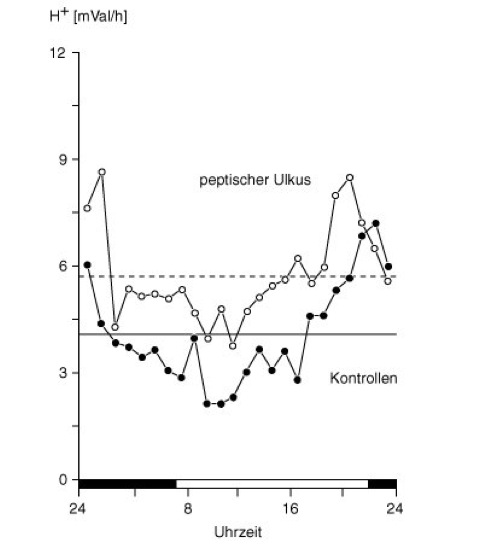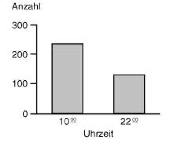 Abb. 4: Anzahl der Magenschleimhautläsionen bei zehn Gesunden, die 1 g Acetylsalicylsäure (Aspirin) morgens um 10 Uhr bzw. abends um 22 Uhr erhalten hatten. Die Anzahl der Läsionen wurde jeweils zwei Stunden nach Aspiringabe mittels Endoskopie bestimmt und photographisch dokumentiert. Der Unterschied ist signifikant. |