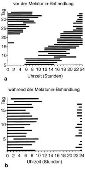 Chronopharmakologiew [von *chrono –, Pharmakologie], beschreibt den Einfluß von Medikamenten (Arzneimittel) auf die physiologischen Rhythmen von Organismen (insbesondere des Menschen) und untersucht die Bedeutung der endogenen Oszillationen auf die Wirkung von Medikamenten. Die Chronopharmakologie ist Teil der Chronobiologie. Ziel chronopharmakologischer Forschung ist die Chronotherapie im Sinne einer Stärkung der positiven Effekte und einer Minderung der toxischen Nebenwirkungen von Medikamenten. – Pflanzen, Tiere und Menschen zeigen unter konstanten Bedingungen im Labor rhythmische Veränderungen in nahezu allen Parametern ihrer Physiologie und ihres Verhaltens. Die Oszillationen sind Ausdruck einer endogenen Periodizität (physiologische Uhr, circadiane Rhythmik), die unter natürlichen Umweltbedingungen mit der äußeren Tagesrhythmik synchronisiert wird. Bei Säugern werden photoperiodische Signale von den Augen (Linsenauge) perzipiert und neuronal über den sog. Nucleus suprachiasmaticus (Strukturen auf beiden Seiten des 3. Hirnventrikels genau oberhalb des Chiasma opticum) und Noradrenalin an das Pinealorgan (Epiphyse, Zirbeldrüse) weitergeleitet. Die Zellen des Nucleus suprachiasmaticus besitzen eine autonome circadiane Rhythmik und stellen einen übergeordneten circadianen Schrittmacher (innere Uhr,biologische Uhr) dar. Das Pinealorgan produziert tagesrhythmisch das Hormon ("Epiphysenhormon") Melatonin. Die Melatoninproduktion hat ihr Maximum in der Nacht – unabhängig davon, ob es sich um einen nacht- (z. B. Ratte) oder tagaktiven Organismus (Mensch) handelt (Aktivitätstyp). Somit ermöglicht das Pinealhormon Melatonin den Organismen die Registrierung der Dunkelheit. Der Schlaf-Wach-Rhythmus (Schlaf) wird durch Licht (Lichtfaktor) synchronisiert und korreliert mit einer entsprechenden Rhythmik der Melatoninausschüttung in die Blutbahn. Die durch die äußere Tagesrhythmik eingestellte oder synchronisierte innere Uhr ermöglicht es den Organismen, sich zeitlich und räumlich zu orientieren. Fast alle bisher untersuchten physiologischen Funktionen von Menschen und Tieren zeigen tageszeitliche Variationen ( vgl. Tab. 1). Zyklische Abläufe spielen eine große Rolle in der internen Koordination des Stoffwechsels. Sie sind essentiell für die Aufrechterhaltung von Wohlbefinden und Gesundheit. – Von besonderer Bedeutung ist in diesem Zusammenhang die junge Wissenschaft der Psychoneuroimmunologie (PNI). Der Begriff wurde 1980 von dem amerikan. Psychologen R. Ader geprägt. Er umschreibt den Forschungsbereich, der sich mit den zahlreichen Wechselwirkungen zwischen seelischem Erleben und Verhalten einerseits und der Aktivität des Immunsystems andererseits auseinandersetzt ( vgl. Abb. 1). Es geht z. B. darum, zu klären, welche Bedeutung u. a. Streß und Depressionen beim Ausbruch und Verlauf von Krankheiten haben. Gerade bei Depressionen spielen chronophysiologische Einflüsse eine besondere Rolle (z. B. saisonale Depression [SAD] oder manisch-depressives Verhalten). PNI-bezogene Forschungen betreffen harmlose Infektionen, aber auch entzündliches Rheuma (Rheumatismus), Allergien, Krebs und AIDS. Über das Immunsystem ist die Psyche direkt oder indirekt am Verlauf der meisten Krankheitsbilder beteiligt. – Die Körpertemperatur des Menschen schwankt jeden Tag um 0,8 °C. Sie erreicht ihr Maximum am frühen Abend und ihr Minimum spät in der Nacht. Die Sekretion von Cortisol hat ihren Tiefstand nach Mitternacht und erreicht ihren Höhepunkt gegen Tagesanbruch. Der Tagesrhythmus in der Plasmacortisolkonzentration ist ein wichtiger Synchronisator für verschiedene physiologische Parameter, wie aus der Substitutionstherapie bei Patienten mit Nebenniereninsuffizienz hervorgeht. Auch das Kreislaufsystem (Blutkreislauf) variiert tagesrhythmisch, wie sich für Herzfrequenz, Blutdruck, peripheren Gefäßwiderstand und Meßgrößen der Herzfunktion (EKG, Elektrokardiogramm) zeigen läßt. Die Plasmakonzentrationen von Hormonen, Neurotransmittern, Glucose, Elektrolyten sowie die Anzahl der Leukocyten, Erythrocyten und Thrombocyten zeigen ebenfalls eine Tagesrhythmik. Die Funktionen von Lunge, Leber und Niere oszillieren in Abhängigkeit von der Tageszeit. Die Sekretion von Magensäure schwankt tagesrhythmisch sowohl bei Gesunden als auch bei Patienten mit peptischem Ulkus ( vgl. Abb. 2). Tagesrhythmische Phänomene werden auch sichtbar bei bestimmten Krankeitsbildern wie Asthma, Angina pectoris, Herzinfarkt oder Epilepsie. Das 24-Stunden-Profil im systolischen Blutdruck oszilliert gleichsinnig bei Hypertonikern (Hypertonie), Gesunden und Herzinsuffizienten ( vgl. Abb. 3). Die Empfindlichkeit des Magens für Arzneimittel ändert sich mit der Tageszeit. Gesunde Probanden, die 1 g Aspirin (Acetylsalicylsäure) um 22 Uhr einnahmen, bekamen 40% weniger Läsionen der Magenschleimhaut als bei morgendlicher Gabe, obwohl der Magen abends mehr Säure produziert ( vgl. Abb. 4). – Die chronotherapeutische Wirkung von Melatonin als. "Schlafhormon" wurde sichtbar bei einer Patientin, die seit früher Kindheit unter einer Schlaf-Wach-Rhythmik mit einer Periodenlänge von 25 h leidet und dadurch keine normale soziale Einbindung hat. Ihr Organismus verhält sich so, als sei er unter sog. Freilaufbedingungen, die sich beim Menschen in einer circadianen Rhythmik mit einer Periodenlänge von etwa 25 Stunden manifestieren (Chronobiologie). Eine Melatoninbehandlung im Alter von 17 Jahren, mit 5 mg Melatonin pro Nacht zwischen 21 h und 22 h gegeben, führte zur Ausprägung einer 24 h-Schlaf-Wach-Rhythmik und damit zu einer Frequenzsynchronisation mit dem täglichen Licht-Dunkel-Wechsel ( vgl. Abb. 5). Im Alter von 14 Jahren wurde bei der Patientin ein Gehirntumor diagnostiziert. Die Ergebnisse der Melatoninbehandlung sprechen dafür, daß der NSC vermutlich aufgrund des Tumors keine Signale von den Augen bekam und damit die endogene Melatoninproduktion im Pinealorgan nicht mit dem täglichen Licht-Dunke