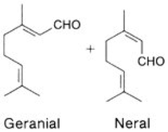 Citral s, nach Zitronen riechendes cis-trans-Isomerengemisch aus Geranial (trans-Citral, Citral a) und Neral (cis-Citral, Citral b), das in zahlreichen etherischen Ölen, besonders in Lemongrasöl, Citronenöl und Basilikumöl, vorkommt sowie Bestandteil von Alarm-Pheromonen (Alarmstoffe) von Insekten ist. Bei der Kondensation von Citral ( vgl. Abb. ) mit Aceton unter alkalischen Bedingungen entsteht Pseudojonon, das im sauren Milieu durch Erhitzen unter Ringschluß in α- und β-Jonon überführt werden kann. Die veilchenartig duftenden Jonone werden in der Riechstoffindustrie verwendet und sind von besonderer Bedeutung für die technische Synthese von Vitamin A (Retinol). Citral dient zur Herstellung von Likören, Parfümen und Kosmetikartikeln. Blütenduft, Isoprenoide.
