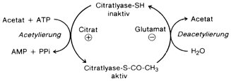 Citratlyasew, das Schlüsselenzym für den anaeroben Abbau von Citrat (Citronensäure, Citronensäurevergärung) bei Milchsäurebakterien, Enterobakterien (Enterobacteriaceae), Veillonella-Arten, Clostridium sphenoides und Rhodopseudomonas gelatinosa. Citratlyase spaltet Citrat in Acetat und Oxalacetat. Bei Milchsäurebakterien wird Oxalacetat dann weiter umgewandelt in Acetoin und Diacetyl, das der Butter den charakteristischen Geschmack verleiht. Bei Rhodopseudomonas gelatinosa wird die Enzymaktivität der Citratlyase durch Acetylierung oder Deacetylierung reguliert ( vgl. Abb. ).