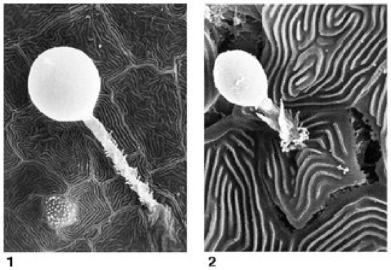 Rasterelektronenmikroskopische Aufnahmen von Cniden beim Eindringen in Epithelzellen des Korallenwelses (Plotosus lineatus). 1 Cnide der Leuchtqualle (Pelagia panopyra), die ohne Stilett und ausgeprägte Schaftdornen in die Oberfläche eindringt. 2 Cnide der Tintenqualle (Catostylus purpurus); bereits 30 Sekunden nach Entladung zeigt die Oberfläche der Zelle Degenerationserscheinungen; 10 Sekunden später löst sie sich aus dem Epithelverband.