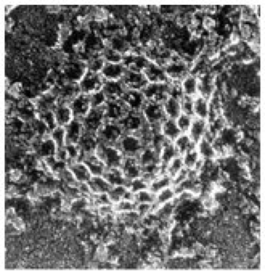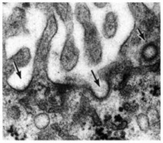 coated vesicles, 1) Clathrin-coated vesicles, intrazelluläre Partikel von 50–250 nm Durchmesser mit charakteristischer, borstenähnlicher Proteinhülle (engl. coat), in der das Protein Clathrin (relative Molekülmasse 650 000) die Hauptkomponente darstellt. Coated vesicles bilden sich aus den coated pits ( vgl. Abb. ) durch Einstülpung der Plasma-Membran während der durch spezifische Rezeptoren induzierten Endocytose von Makromolekülen oder größeren Komplexen. Die coated pits ( vgl. Abb. ) sind spezielle Bereiche der Plasmamembran, die an der dem Plasma zugekehrten Seite ebenfalls die für coated vesicles charakteristische borstenförmige Proteinschicht aufweisen. Kurz nach ihrer Entstehung verlieren die coated vesicles ihre Proteinhülle. Ein ATP-abhängiges Protein, die uncoating ATPase, entfernt Clathrin von den Vesikeln. Die Clathrin uncoating ATPase ist ein cytoplasmatisches Protein, das zu den molekularen Chaperonen der Hsp70-Familie zählt (Polypeptidketten bindende Proteine). Nach Entfernung der Clathrin-Hülle fusionieren die Vesikel mit anderen intrazellulären Vesikeln und schließlich mit den primären Lysosomen. In diesem früher als CURL (compartment of uncoupling of receptor and ligand) bezeichneten Kompartiment kommt es zur Freisetzung der endocytierten Liganden von ihren Rezeptoren. Clathrin-umhüllte Vesikel entstehen außerdem an der trans-Seite des Golgi-Apparats; sie sind am vesikulären Transport von Substanzen zwischen dem Golgi-Apparat, Lysosomen und anderen Organellen beteiligt. Lysosomale Proteine werden z. B. vom Mannose-6-phosphat-Rezeptor im trans-Bereich des Golgi-Apparats gebunden, der Rezeptor selbst assoziiert an Strukturen der Clathrin-Hülle und vermittelt so die Trennung lysosomaler Proteine von Proteinen mit anderen Zielorten. Bevor die Vesikel mit der lysosomalen Membran fusionieren und ihren Inhalt freisetzen können, muß, wie bei der Endocytose, zunächst die Clathrin-Hülle entfernt werden. Freie Clathrin-Proteine werden an die Plasmamembran sowie die trans-Golgi-Membranen zurückgebracht, um die rezeptorvermittelte Endocytose sowie den Transport vom Golgi-Apparat zu Lysosomen aufrechtzuerhalten. Virusinfektion. 2) COP-coated vesicles (COP = coat protein), intrazelluläre Vesikel, deren Hülle nicht aus Clathrin besteht, sondern aus anderen Proteinen, welche die Vesikelmembran weniger strukturiert umgeben. Mit COP-Proteinen umhüllte Vesikel vermitteln Transportvorgänge zwischen dem endoplasmatischen Reticulum (ER) und dem Golgi-Apparat, zwischen den einzelnen Golgi-Zisternen sowie vom Golgi-Apparat zur Plasmamembran. Dabei werden zwei Formen von Vesikelhüllen unterschieden. Die eine (COPI) setzt sich aus dem kleinen GTP-bindenden Protein (G-Protein) ARF und dem sog. Coatomer, einem aus 7 Untereinheiten bestehenden Komplex mit der relativen Molekülmasse von 700 000, zusammen. COPI vermittelt nicht nur den Transport vom ER zum Golgi-Apparat, sondern auch den retrograden Transport vom Golgi-Apparat zum ER. Dies ist von Bedeutung zum Zurückführen von Proteinen, die bei Transportvorgängen aus dem ER entwichen sind; entsprechende Proteine sind u. a. durch die Aminosäureabfolge KDEL gekennzeichnet. COPII besteht aus dem GTP-bindenden Protein Sar1p, einem Proteinkomplex mit den Untereinheiten Sec13p und Sec31p, und einem zweiten Komplex mit den Untereinheiten Sec23p und Sec24p. Im Gegensatz zu COPI ist COPII ausschließlich an der Vesikelbildung am ER beteiligt. Sowohl COPI als auch COPII erkennen zwar spezifische Sequenzmotive der Proteine, die in den von ihnen umschlossenen Vesikeln transportiert werden, insgesamt jedoch scheint der Transport weniger spezifisch zu verlaufen, als dies bei Transportvorgängen mit Beteiligung der Clathrin-coated vesicles der Fall ist. Vor dem Andocken an die Zielmembran erfolgt die Auflösung der COP-Hülle, ausgelöst durch die Hydrolyse von GTP an den assoziierten G-Proteinen. Dies macht das von der Donormembran stammende Protein v-SNARE zugänglich, das dann mit dem als t-SNARE bezeichneten Akzeptorkomplex in der Zielmembran interagieren kann. Adaptine, Adaptorproteine, Clathrin-assembly-Partikel, Exportproteinsynthese, Golgi-Apparat.