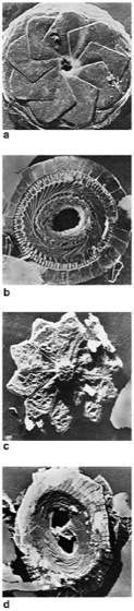 a und b fossile Coccolithen mit sich überlappenden Kristallzellen, c und d Coccolithen einer in der Tiefseeplattform der Biscaya lebenden Coccosphaeren-Art. Die Coccolithen haben zwischen 0,002 und 0,01 mm Durchmesser.