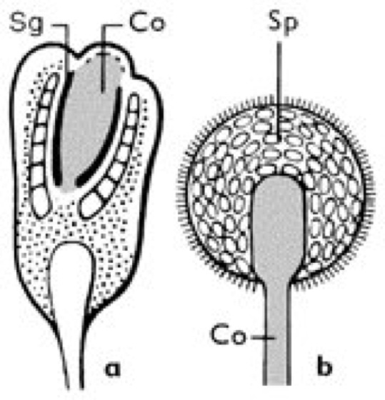 Columella bei a einem Sporogon von Funaria, b einem Sporangium von Mucor (Co Columella, Sp Sporenraum mit Sporen, Sg sporogenes Gewebe)