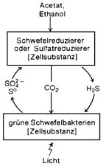 Syntropher Stoffwechsel eines Consortiums, das sich aus einem chemoorganotrophen Schwefelreduzierer (Desulfuromonas) oder Sulfatreduzierer (Desulfovibrio) und phototrophen, grünen Schwefelbakterien (z. B. Chlorobium oder Pelodictyon) zusammensetzt. Schwefel wird nur in geringen Mengen benötigt, da es im Licht abwechselnd oxidiert und reduziert wird. Wenn die phototrophen Bakterien viele organische Stoffe ausscheiden, kann ein solches Consortium auch ohne Zugabe organischer Stoffe leben.