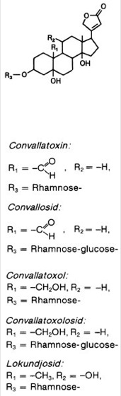 Convallariaglykoside, sowohl im Kraut als auch in den Blüten des Maiglöckchens(Convallaria majalis) enthaltene herzwirksame Glykoside (Herzglykoside), z. B. Convallatoxin, Convallosid, Convallatoxol, Convallatoxolosid, Lokundjosid ( vgl. Abb. ).
