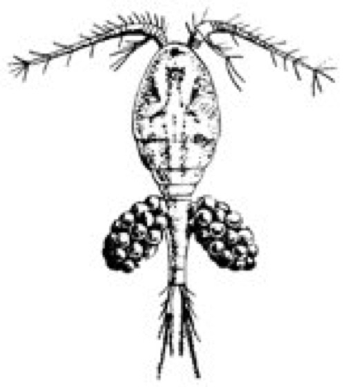 Copepoda [von griech. kōpē = Ruder, podes = Füße], Copepoden, Ruderfußkrebse, Unterklasse der Krebstiere mit ca. 8500 Arten ( vgl. Tab. ). Die Ruderfußkrebse sind kleine Krebse (1 bis wenige mm), nur die Tiefseeart Bathycalanus sverdrupi erreicht 17 mm und die an Walen parasitierende Penella balaenopterae sogar 32 cm. Charakteristische Merkmale: der Rumpf besteht nur aus 10 Segmenten; von den 6 Thorakalsegmenten sind 1 oder 2 mit dem Kopf zum Cephalothorax verschmolzen; Carapax und Komplexaugen fehlen. Der Körper besteht meist aus 2 Abschnitten, einem vorderen mit Extremitäten und einem hinteren ohne Beine ( vgl. Abb. ). Die Gelenkung zwischen beiden Abschnitten liegt zwischen den letzten beiden Thorakalsegmenten (Ordnungen Cyclopoidea, Harpacticoidea) oder zwischen letztem Thorakal- und erstem Abdominalsegment (Calanoidea). Der hintere Abschnitt ist schmaler als der vordere und endet mit der Furca. – Die 1. Antennen sind lang und vor allem bei planktischen Arten oft zu langen Schwebefortsätzen geworden, die beim Vorschnellen passiv nach hinten bewegt werden. Die Thorakalbeine sind Spaltfüße mit fast gleichem Endo- und Exopoditen. Durch ihr Zurückschlagen bewirken sie das sprungartige Vorschnellen (Hüpferlinge). Nur der 1. Thorakopode ist als Maxilliped den Mundwerkzeugen angeschlossen, und das letzte Paar ist rückgebildet oder, beim Männchen, zur Übergabe der Spermatophore bei der Paarung modifiziert. – Exkretionsorgane sind Maxillendrüsen. Die Calanoidea besitzen noch ein kurzes Herz, sonst sind Kreislauforgane rückgebildet. Spezielle Atemorgane fehlen. Sinnesorgane sind, neben Cuticularsensillen, Naupliusaugen, die recht hoch entwickelt sein können, z. B. bei Copilia und beim Saphirkrebschen. Die Ruderfußkrebse sind getrenntgeschlechtlich. Bei der Paarung heftet das Männchen dem Weibchen eine Spermatophore in die Nähe der Geschlechtsöffnung, die am Genitalsegment (verschmolzenes 1. und 2. Abdominalsegment) liegt. Durch eine Quellmasse in den Spermatophoren wird das Sperma von dort in die Receptacula seminis des Weibchens gedrückt. Die Eier werden in charakteristischen Eisäcken (2 bei den Cyclopoidea, 1 bei den Calanoidea und Harpacticoidea) am Genitalsegment getragen ( vgl. Abb. ). Die Entwicklung geht über das Nauplius-, mehrere Metanauplius- und Copepoditstadien. Ruderfußkrebse leben in allen aquatischen Lebensräumen, marin und limnisch, im Plankton, im Litoral, im Grundwasser, auch in kleinsten Wasseransammlungen, z. B. Bromeliaceen-Trichtern und Baumhöhlen, einzelne Harpacticoidea sogar auf dem Land. Ihnen genügt ein dünner Feuchtigkeitsfilm, und bei Trockenheit können sie sich encystieren. Die planktischen Calanoidea sind Filtrierer, die mit den Maxillipeden und den Maxillen einen Wasserstrom erzeugen. Cyclopoidea und Harpacticoidea sind mehr Detritusfresser, manche auch Räuber. Acanthocyclops vernalis enthält im Darm viele unverdaute Grünalgen, die dort weiterhin Photosynthese betreiben. In großer Zahl und in mehreren Linien sind Ruderfußkrebse zum Parasitismus übergegangen. Parasitisch sind oft die Adulten, aber bei den Monstrilloidea leben diese frei, und nur die späten Metanauplius- und Copepoditstadien sind parasitisch. Bei den Lernaeidae und Penellidae (syn. Lernaeoceridae) gibt es Wirtswechsel. Bei Lernaeocera branchialis heftet sich der Copepodit an die Kiemen von Flundern und anderen Plattfischen, wandelt sich zu dem auch von verwandten Familien bekannten Chalimus-Stadium, das sich mit einem Stirnfaden festheftet, und saugt Blut. Auf diesem Wirt häuten sich die Tiere zum Männchen bzw. praeadulten Weibchen und kopulieren. Nach der Paarung stirbt das Männchen, und das Weibchen sucht den Endwirt, einen Schellfisch, auf, wo es sich mit Kopffortsätzen fest verankert und zu einem unbeweglichen, wurmartigen Gebilde auswächst. Ruderfußkrebse sind wegen ihres reichen Vorkommens von großer ökologischer Bedeutung. Calanus finmarchicus ist die wichtigste Nahrung des Herings. Zur Sinnesphysiologie vgl. Infobox.Achtheres, Nahrungskette, Nauplius, Plankton.