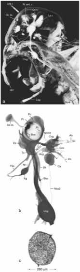 Zentral- und stomatogastrisches Nervensystem sowie retrocerebraler endokriner Drüsenkomplex der Wanderheuschrecke Locusta migratoria: a Lage im Kopf, b freipräpariert und neurosekretorisches System angefärbt, c histologischer Schnitt durch ein Corpus allatum.