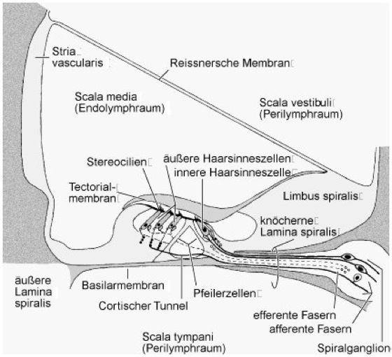Cortisches Organ [benannt nach A.G.G. de Corti], Organum spirale, Teil des Gehörorgans im Innenohr (Cochlea) der Vögel und Säugetiere. Es besteht aus der Basilarmembran, den darauf liegenden Sinnes- und Stützzellen sowie der Tectorialmembran (Deckmembran, vgl. Abb. ) und ist ein äußerst raffiniert ausgebildeter biomechanischer Apparat. Ein akustischer Reiz (Schall) setzt die Basilarmembran in Schwingung. Wenn sich durch diese Bewegung die Basilarmembran gegen die Tectorialmembran verschiebt, erfolgt eine Auslenkung der auf den Haarsinneszellen (Haarzellen) stehenden Stereocilien. Infolge dieser Auslenkung kommt es zur Transduktion akustischer Reize in zelluläre Signale, die über die afferente Innervierung der Haarsinneszellen durch Neurone des Spiralganglions dem auditorischen Hirnstamm zugeführt werden. Die Haarsinneszellen sind phylogenetisch durch starke Längsstreckung aus der Papilla basilaris der Reptilien hervorgegangen. Man unterscheidet äußere und innere Haarzellen, die von ihrem Aufbau recht ähnlich, von ihrer Funktion her jedoch sehr verschieden sind. Dienen die in einer Reihe angeordneten inneren Haarzellen (Mensch: 3500, Ratte: 850) vor allem der Leitung sensorischer Information in das Gehirn, so haben die viel zahlreicheren (Mensch: 15 000, Ratte: 3500), in 3 Reihen angeordneten äußeren Haarzellen z. T. die Aufgabe, die mechanischen Eigenschaften des Cortischen Organs auf die momentane akustische Wahrnehmungssituation einzustellen. auditorisches System, Cochlear-Implantat, Ohr, Tonotopie; Gehörorgane.