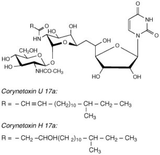 Corynetoxine, Nucleoside aus Uracil, N-Acetylglucosamin und dem C11-Aminozucker Tunicamin, an den Fettsäuren gebunden sind ( vgl. Abb. ). Corynetoxine werden von Corynebacterium rathayi gebildet, das am Steifen Lolch (Lolium rigidum) parasitierende Fadenwürmer befällt. Sie werden vor allem von Weidetieren aufgenommen, die befallenes Gras fressen, und bewirken eine Hemmung der Biosynthese von Glykoproteinen, woraus sich vielfältige Folgeerscheinungen ergeben. Hierzu gehören neurologische Störungen, die auf einer Schädigung kleiner Blutgefäße, besonders im Kleinhirn, beruhen. Vergiftungssymptome sind: Taumeln, Koordinationsstörungen, Versteifung der Gliedmaßen, Krämpfe, Kollaps und, bei einem Teil der Fälle, auch der Tod.