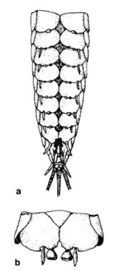 a Unterseite des Hinterleibs eines Urinsekts (Machilis) mit jeweils rechts und links erkennbaren Coxiten und anhängenden Styli; b ein Segment als Detail mit Styli und innen jeweils einem Coxalbläschen