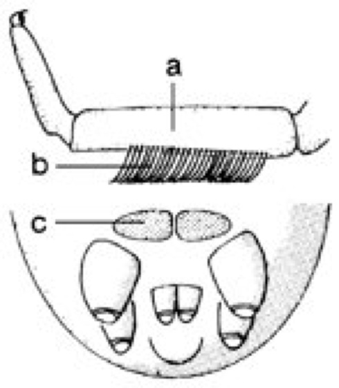 Abb. oben: Hinterbein mit Calamistrum (b) am Metatarsus (a); Abb. unten: Hinterende der Spinne (ventral) mit den Spinnwarzen und dem Cribellum (c)