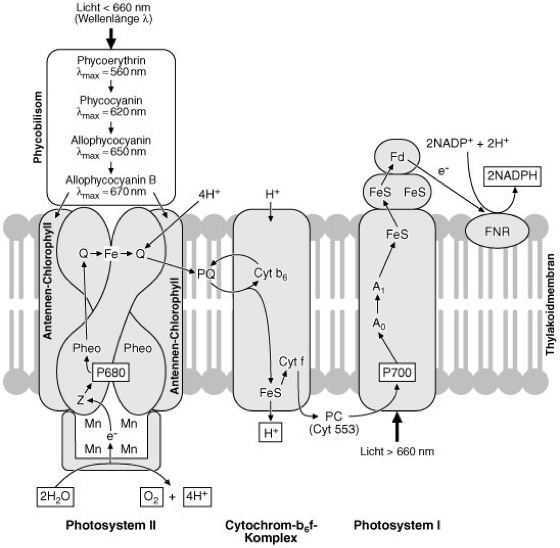 Vermehrung und Fortpflanzung: Die Vermehrung erfolgt meist durch Zweiteilung. Einige Cyanobakterien vermehren sich durch Sprossung (Exosporen; z. B. Chamaesiphon;Chamaesiphonaceae). Es können auch Vielteilungen in kleine Zellen auftreten (Nanocytenbildung). Erfolgt die Zellteilung innerhalb besonderer Zellen (Sporangien), so werden die Teilungszellen Baeocyten genannt (früher als Endosporen bezeichnet, z. B. Dermocarpa). Die Vermehrung kann auch durch kurze, bewegliche Fadenstücke (Hormogonien) erfolgen (bei Oscillatoria,Cylindrospermum), die durch Zerfall des ganzen Filaments oder an der Spitze von verzweigten Fäden gebildet werden (Scytonema; Stigonema;Stigonematales). Überdauerungsfilamente mit Reservestoffeinlagerungen (Granulabildung) und dickeren Scheiden werden als Hormocysten bezeichnet. Eine geschlechtliche Vermehrung ist bei Cyanobakterien nicht bekannt. Eine parasexuelle Übertragung (Parasexualität) von Genmaterial (z. B. Antibiotika-Resistenz) ließ sich bei einigen Arten nachweisen. – Stoffwechsel: Alle Cyanobakterien führen einen (photolithoautotrophen; Photolithotrophie) Lichtstoffwechsel aus, in dem O2 freigesetzt und CO2 im Calvin-Zyklus assimiliert wird (Photosynthese; vgl. Abb. ). Im Gegensatz zu dem der anoxygenen phototrophen Bakterien (anoxygene Photosynthese) enthält der oxygene Photosyntheseapparat der Cyanobakterien zwei Photosysteme, durch die bei Belichtung ein elektrochemischer Protonengradient (protonenmotorische Kraft), NADPH (zur Kohlendioxidfixierung) und O2 entstehen. Photosystem II (PSII) mit dem Reaktionszentrum-Chlorophyl P680 ist für die Wasserspaltung (Wasser:Plastochinon-Oxidoreductase) verantwortlich; durch Photosystem I (PSI) mit dem Reaktionszentrum-Chlorophyll P700 findet eine Reduktion von NADP+ statt (Plastocyanin: Ferredoxin-Oxidoreductase, Ferredoxin: NADP-Oxidoreductase). PSII und PSI sind durch einen linearen Elektronentransport über die Membran (über einen Cytochrom-b6f-Komplex) miteinander verbunden. Als Haupt-Antennenpigment fungieren Phycobiliproteine (Phycocyanin, Allophycocyanin, Phycoerythrin), die, zu Phycobilisomen zusammengelagert, an der Oberfläche der Thylakoidmembranen angeheftet sind. Daneben wirkt noch Bakteriochlorophyll a (Bakteriochlorophylle) als Lichtsammler. Einige Arten wachsen im Licht auch mit einfachen organischen Stoffen, z. B. Glucose oder Acetat (Photoassimilation, photoorganoheterotroph; Photoorganotrophie) oder sind befähigt, eine bakterielle (anoxygene) Photosynthese auszuführen mit H2S (Schwefelwasserstoff) oder H2 (Wasserstoff) anstelle von H2O (Wasser) als Wasserstoffdonor zur CO2-Reduktion, z. B. Oscillatoria limnetica (phototrophe Bakterien). Es gibt auch fakultativ chemotrophe Formen, die im Dunkeln z. B. mit Glucose als Energie- und Kohlenstoffquelle wachsen. Glucose wird dabei im oxidativen Pentosephosphatzyklus vollständig zu CO2 oxidiert. Da sie keinen Citratzyklus besitzen, kann Acetyl-Coenzym A nicht oxidiert werden. Die Komponenten der Atmungskette sind auf den Thylakoidmembranen lokalisiert. Es gibt auch obligat phototrophe Cyanobakterien (Phototrophie). Diese Arten besitzen gleichfalls keinen vollständigen Citratzyklus (α-Ketoglutarat-Dehydrogenase [=2-Oxoglutarat-Dehydrogenase] fehlt). Als Stickstoffquelle kann Ammonium oder Nitrat genutzt werden. Liegt kein gebundener Stickstoff vor, können viele Arten Luftstickstoff (N2) fixieren.
