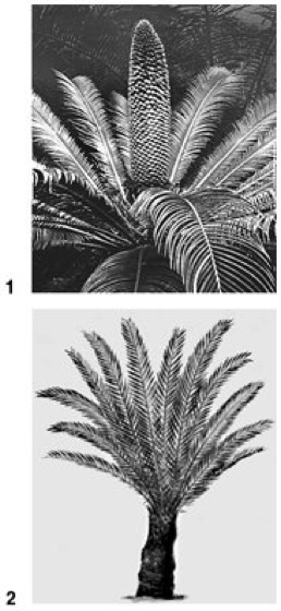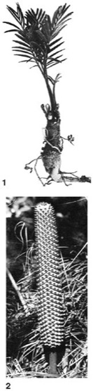 1 Macrozamia communis (junge Pflanze); 2 männlicher Zapfen (Androstrobilus) von Ceratozamia purpusii (Palmfarn aus Mexiko) mit zahlreichen Mikrosporophyllen