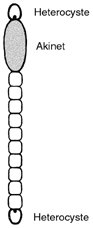 Cylindrospermum s [von *cylindro –, griech. sperma = Same], Gattung der Nostocaceae (Nostocales). Die fädigen Cyanobakterien (Blaualgen) sind unverzweigt, mit gleich breiten Trichomen, die durch interkalare Zellteilung wachsen. Bei Fehlen von gebundenem Stickstoff entwickeln sich Heterocysten an den Enden des Trichoms. Die Vermehrung erfolgt durch Bruch der Trichome und durch Akineten (Dauerzellen), die immer neben den Heterocysten ausgebildet werden ( vgl. Abb. ). Vorkommen meist in stehenden Gewässern und auf feuchter Erde, oft in Warmhäusern. Landalgen.