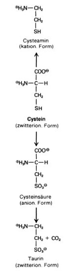 Durch Decarboxylierung von Cystein entsteht Cysteamin. Oxidative Abbauprodukte von Cystein sind Cysteinsäure und Taurin.