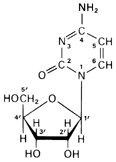 Cytidin s, Abk. Cyd oder Cyt, ein Nucleosid, das aus der Base Cytosin und dem Zucker β-D-Ribose aufgebaut ist ( vgl. Abb. ); Bestandteil von Ribonucleinsäuren (RNA) und Coenzymen.