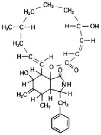 Cytochalasane [von *cyto –, griech. chalasis = das Nachlassen], Cytochalasine, Gruppe von vor allem aus Schimmelpilzen (z. B. Helminthosporium dematioideum) isolierten cytostatisch wirksamen Stoffwechselprodukten (Toxinen). Sie binden an Actin und verhindern dessen Polymerisation. Zellen, die mit Cytochalasin behandelt wurden, besitzen keine Actinfilamente und verlieren damit die Fähigkeit zur Cytokinese, Phagocytose und zu amöboider Bewegung. Im Gegensatz zur Wirkung von Colchicin wird die Mitose durch Cytochalasine nicht gestört. Weitere Eigenschaften der Toxine sind: antibiotische Wirkung, Hemmung des Glucosetransports, der Sekretion von Thyroid- und Wachstumshormonen sowie Blutplättchenaggregation. Größte Bedeutung haben Cytochalasin A (Dehydrofomin) und Cytochalasin B (Phomin; vgl. Abb. ). Die Biosynthese erfolgt ausgehend von Phenylalanin und einem Nonaketid; die Methylgruppen stammen von Methionin. Apoptose.