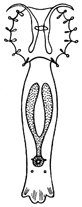 Dactylogyrus m [von *dactylo –, griech. gyros = krumm], Gattung der Monogenea (Hakensaugwürmer), Kiemenparasiten an verschiedenen Fischarten, bis 2 mm lange Saugwürmer mit über 20 Arten in Mitteleuropa; vierzipfliges Vorderende mit 4 Pigmentbecherocellen; Hinterende scheibenförmig mit 14 Häkchen am Rand und 2 zentralen, großen, miteinander verbundenen Skleriten (Haftapparat, vgl. Abb. ). Eier werden ins freie Wasser abgegeben; Oncomiracidien befallen direkt ihren Fischwirt; Adulti sterben nach der Eiablage. Bekannte Art: Dactylogyrus vastator, Ektoparasit auf den Kiemen von Karpfen (Cyprinus spec.); kann Jungfische erheblich schädigen; die Kiemenepithelien werden zerstört, und es kommt zum Erstickungstod.